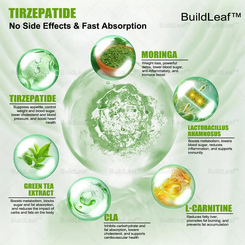 Ingredients:ย Tirzepatide๏ผMoringa๏ผL-Carnitine๏ผLactobacillus rhamnosus๏ผCLA๏ผGreen Tea Extract๏ผApple Cider Vinegar