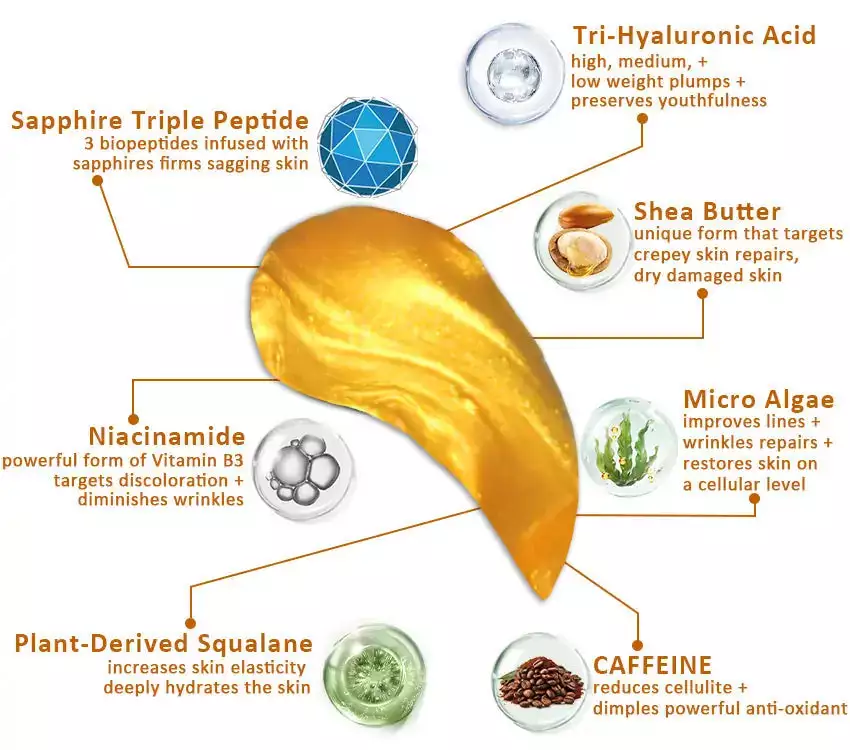 - Sapphire-Infused Triple Peptide: Targets sagging skin and boosts collagen