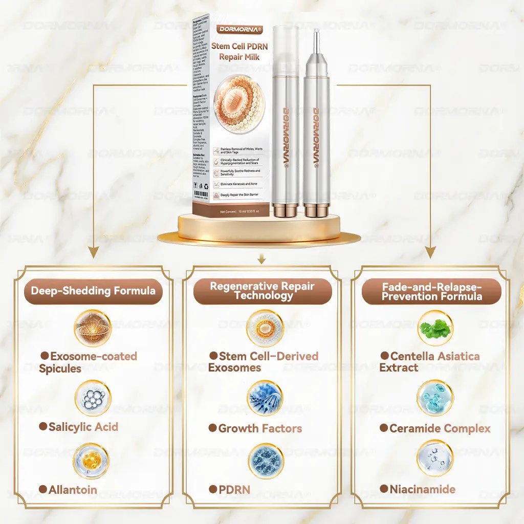 Unlike traditional corrosive agents, lasers, or electrocautery that rely on destructive removal, DORMORNAยฎ introduces a synergistic system of Stem Cell Exosomes + Liquid Microneedles to activate natural loosening and regeneration from the root of the lesion, achieving safer and more complete results.