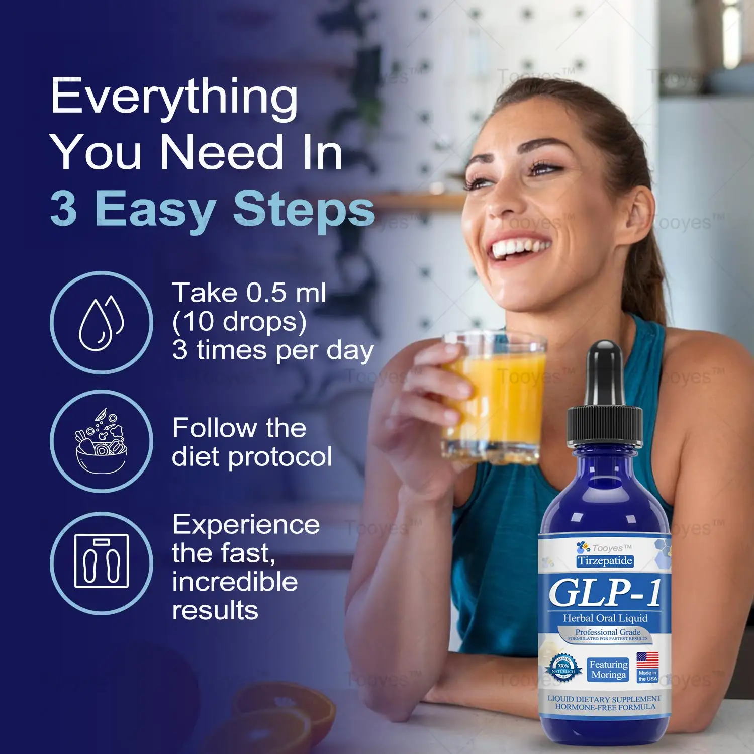 Tooyes dropsย combineย Tirzepatide,ย Moringa, and variousย natural herbal ingredientsย to address theย root causes of obesity. They helpย control appetite, improveย blood sugar levels, boostย fat metabolism, and effectivelyย reduce fat buildup. With thisย natural, painless oral solution,ย Tooyes dropsย not only help you lose weight easily but also improveย health issues caused by obesity, such asย high blood sugar,ย heart strain, andย joint pressure.ย Simple, safe, and a true alternative to complicated diets and workouts, giving you a trulyย effortless, healthy lifestyle!