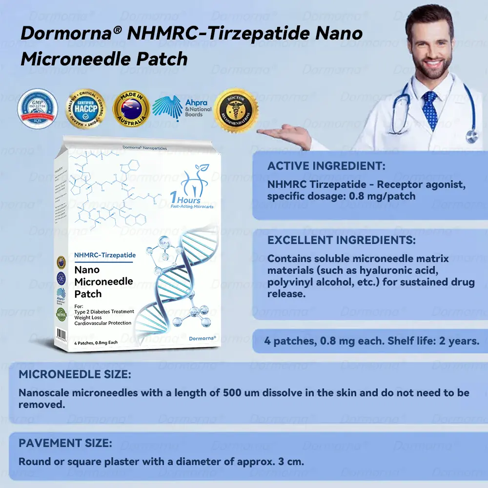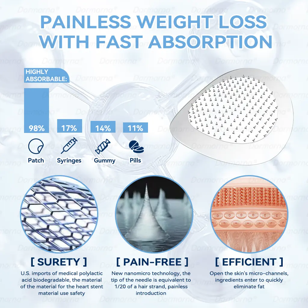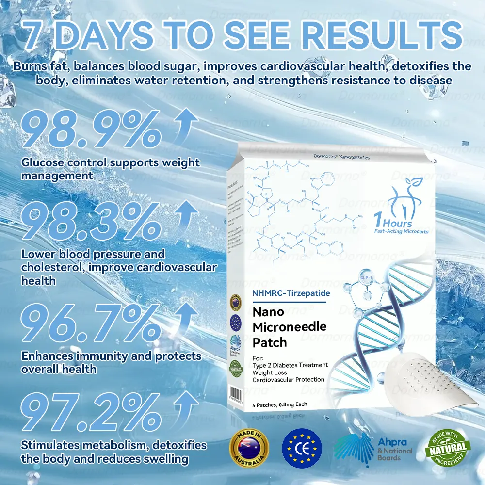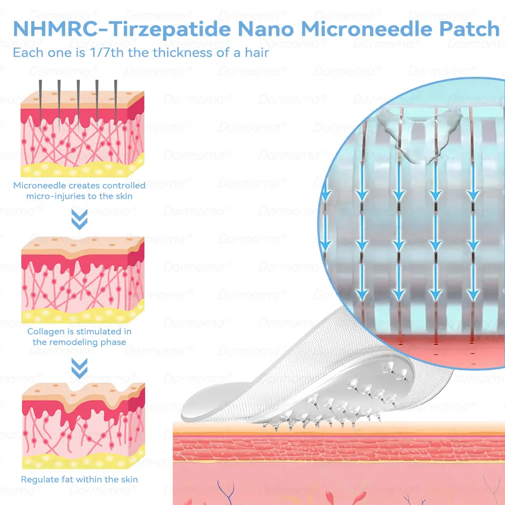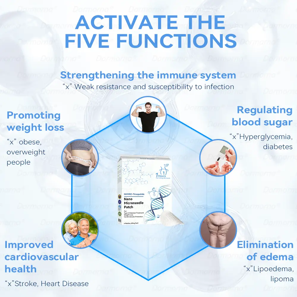 The nano-microneedle patch contains ๐๐ป๐๐ ๐ถ-๐๐๐๐ง๐๐๐๐ก๐๐๐ in each patch. It mimics the action of glucagon-like ๐๐ป๐๐ ๐ถ-๐๐๐๐ง๐๐๐๐ก๐๐๐, promoting insulin secretion, inhibiting glucagon secretion, and delaying gastric emptying, contributing to blood sugar control and aiding weight loss.