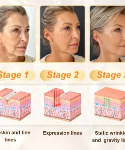 - Static and Gravity Lines: When the skinโs “support structure”โcollagen and elastin fibersโbegins to deplete, gravity gradually pulls the skin down, creating static wrinkles. This is why our jawline can lose definition, and the skin on our neck and dรฉcolletage becomes saggy.
