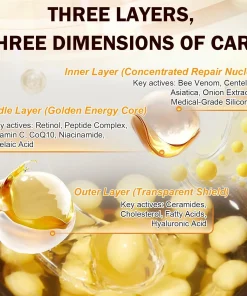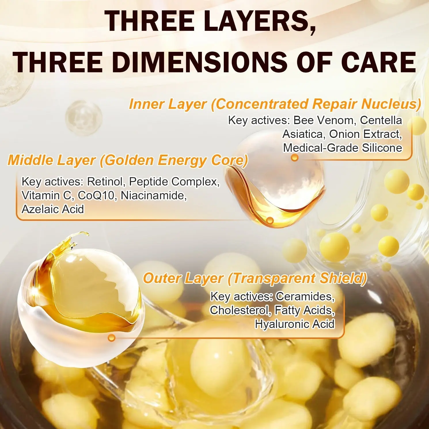 Each ๐ซ๐๐๐๐๐ยฎ microcapsule delivers a precise burst of clinically proven actives. With every application, hydrating agents like hyaluronic acid and barrier-strengthening ceramides are released first, followed by a controlled dose of retinol, peptides, and antioxidants to smooth wrinkles and fade dark spots. At the core, intensive repair factors such as CICA and onion extract penetrate deeper layers, calming irritation and visibly reducing scars. The liposomal outer shell enhances absorption and ensures stability, giving your skin a powerful yet gentle multi-layer repair with every use.