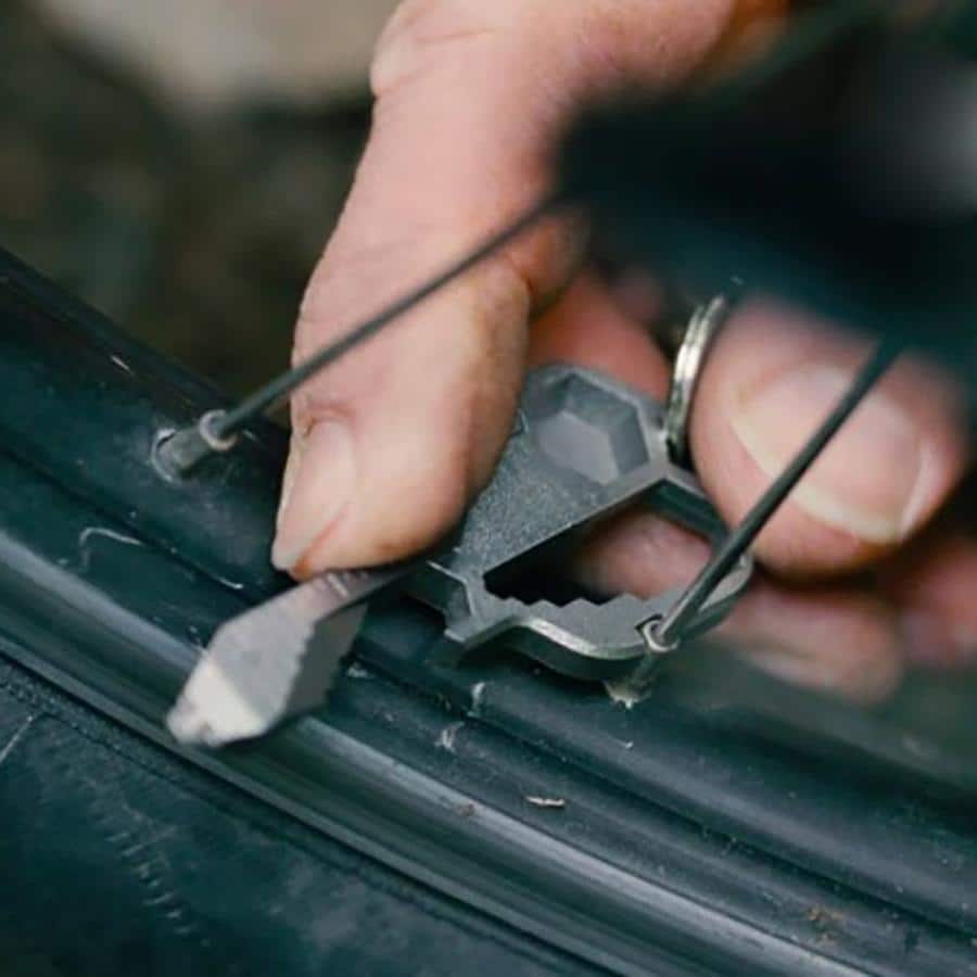 Tool key features include a Pipe, 3.2/3.3mm Bike Spoke Key, a Screw Driver tip that will fit a #2/3 Slotted, #2 Square Drive, #2/3 Phillips, and #2/3 Combinations (Phillips/Slotted or Phillips/Square) screw all in one bit, Imperial and Metric Closed Wrench, ¼ inch Open Wrench, ¼ inch Bit Driver, Scoring Tip, Serrated Edge, Can Opener, Wire Stripper, File, Imperial and Metric Ruler, Protractor, Bottle Opener, Multi-head fit Driver, and Lanyard Hole.