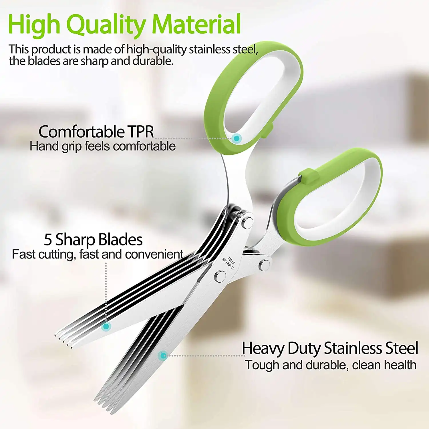 5 high precision, sharp stainless steel blades for cutting, chopping or mincing herbs directly into a pan or on a plate to garnish.
