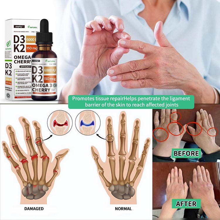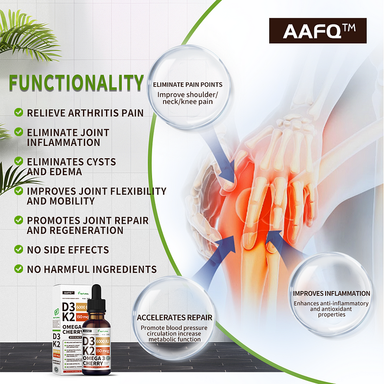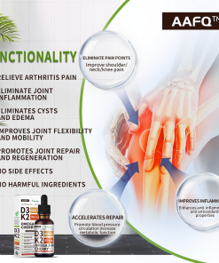 Arthritis encompasses a range of inflammatory diseases triggered by infection, degeneration, or trauma, leading to symptoms such as redness, swelling, heat, pain, dysfunction, and deformity. These can result in joint disability and diminish patients’ quality of life. The AAFQ™ Anti-Inflammatory Joint Repair & Strengthening Tincture effectively reduces inflammation and enhances nutritional support for the joints through potent ingredients like deer antler and Omega-3 fatty acids, aiding in the repair of damaged joint tissue and improving pain and dysfunction.