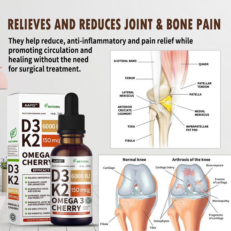 When taken orally, ingredients like deer antler and dandelion root promote circulation and eliminate harmful substances, while cherry extract and resveratrol alleviate swelling and pain by modulating inflammation. Omega-3 fatty acids reduce joint inflammation, while curcumin assists in repairing damaged tissues. Additionally, vitamins D3 and K2 enhance bone health, improve calcium absorption, and support joint function.