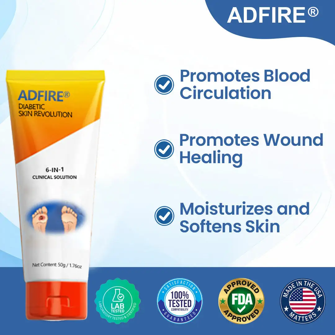 ADFIRE® Diabetic Skin Revolution is designed to help people with diabetes keep their feet healthy. It boosts blood circulation. helps heal foot ulcers and sores faster. and provides gentle care for diabetic skin. The cream hydrates deeply to prevent dryness and cracking. while also protecting sensitive skin from infections. Its smooth. quick-absorbing formula makes it easy to use every day. giving you an effective way to care for your feet.