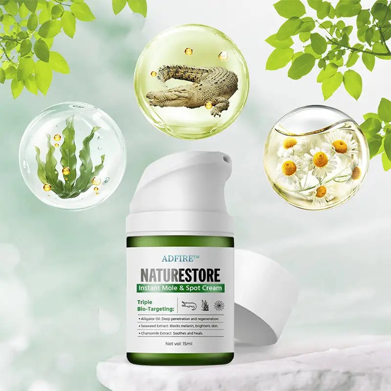 La Crema Instantánea para Lunares y Manchas ADFIRE™ NATURESTORE ofrece una solución rápida y eficaz para eliminar imperfecciones de la piel como lunares, acrocordones, manchas oscuras e imperfecciones. Su potente fórmula, enriquecida con tres ingredientes naturales —aceite de caimán, extracto de manzanilla y extracto de algas— , actúa suavemente para eliminar las imperfecciones sin dolor, revelando una piel suave, radiante e impecable.