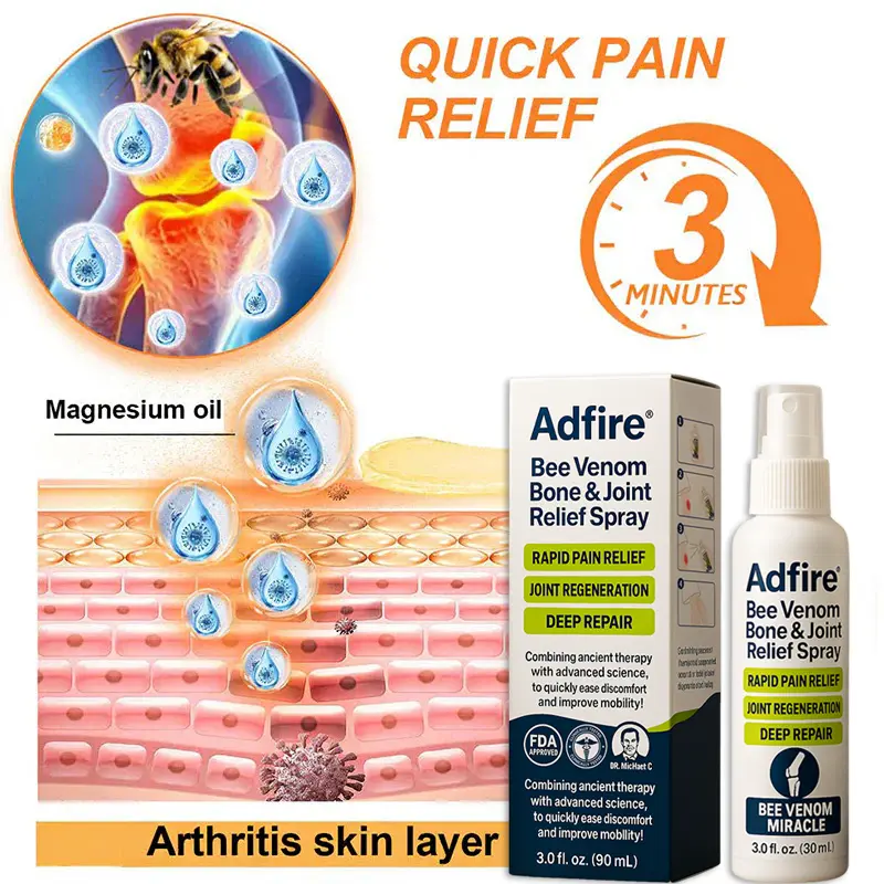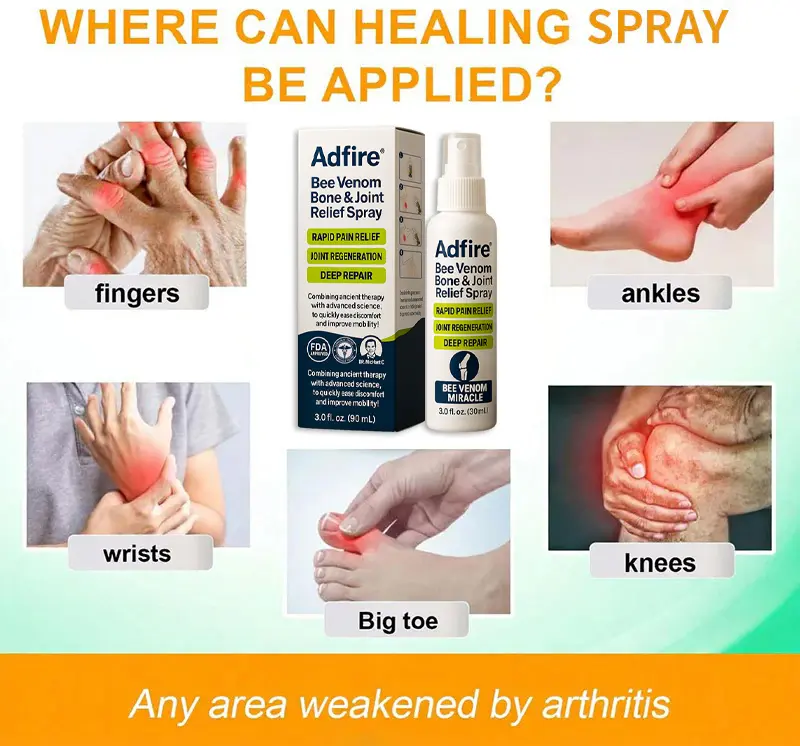 ADFIRE® Bee Venom Pain-Relief Bone Healing Spray This product is certified and recommended by FDA. meeting their high standards to effectively relieve pain and promote bone health. Approved by orthopedic doctors. it relieves pain within 5 minutes. restores joint mobility in 7 days. and significantly improves arthritis symptoms in 4 weeks. Choose our ADFIRE® Bee Venom Pain Relief Bone Healing Spray and enjoy reliable results and a pleasant experience with confidence.