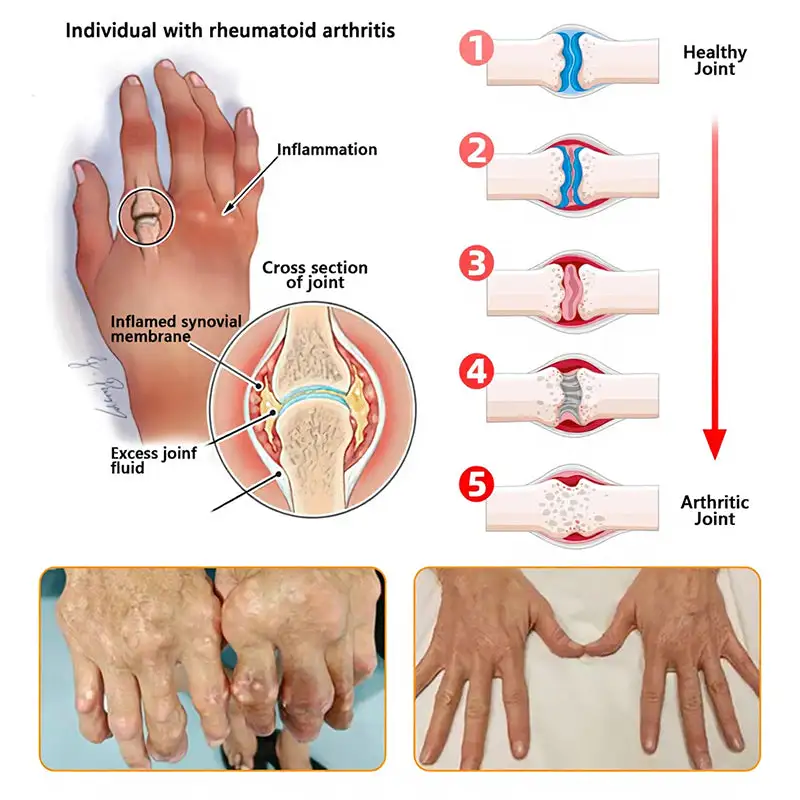 Rheumatoid Arthritis (RA) is a chronic inflammatory disease that causes inflammation and damage to the joints due to the autoimmune system attacking the synovial lining of the joints. Rheumatoid arthritis is characterized by joint pain. swelling. and stiffness. and usually occurs in small joints such as the fingers. wrists. knees. and ankles. but may affect other large joints as well.