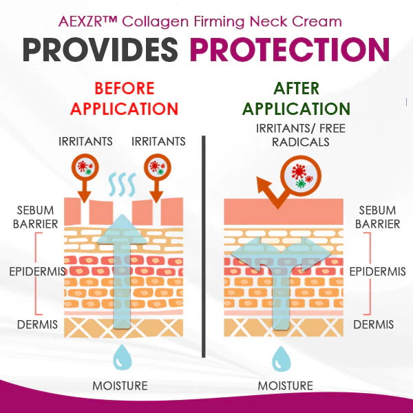 AEXZR™ Collagen Firming Neck Cream works by delivering a powerful combination of ingredients that work together to nourish, firm, and rejuvenate the skin on your neck.
