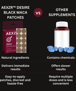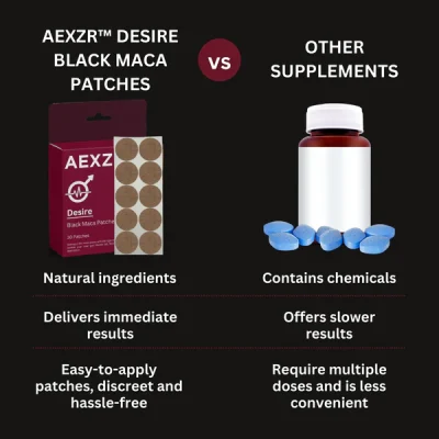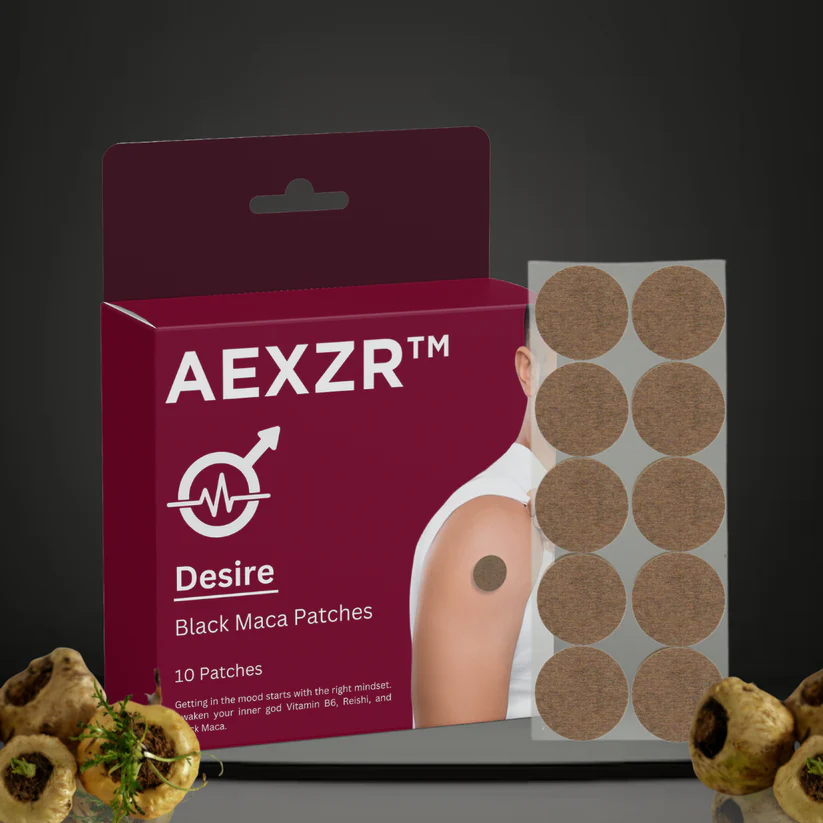 AEXZR™ Desire Black Maca Patches offer a natural and effective alternative to traditional pharmaceutical solutions like little blue pills for enhancing sexual performance. Unlike little blue pills, which works by increasing blood flow through vasodilation to achieve its effects, AEXZR™ patches leverage a blend of Black Maca, Reishi, and Vitamin B6 delivered via a transdermal system to address sexual wellness comprehensively. The patches work by directly releasing active ingredients into the bloodstream, supporting hormone regulation, boosting libido, and increasing overall energy levels.