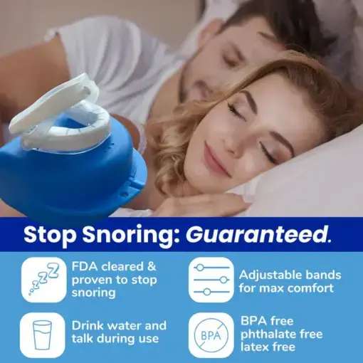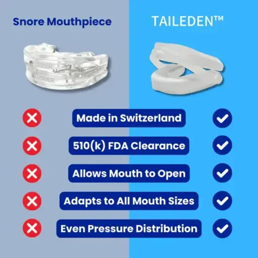 Inspired by Switzerland’s top-selling snoring solution, the TAILEDEN™ Anti-Snore Mouth Guard+ is FDA-cleared and clinically proven to reduce snoring by gently positioning your jaw forward — helping you breathe more easily while you sleep. Custom-molded to fit your unique mouth shape, it offers unmatched comfort compared to typical one-size-fits-all devices. Unlike rigid guards, TAILEDEN™ features adjustable bands that let your jaw move freely, so you can talk or even sip water without it slipping out.