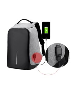 Anti-Theft Backpack has tear-resistant, water-resistant fabric, which holds its shape and has a sleek look, available in gray or black.