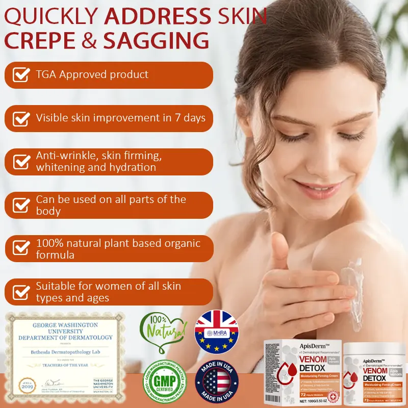Experience firmer, smoother, and more toned skin with the power of ApisDerm™ VenomDetox Moisturizing FirmingCream. Certified by Dr. Shanaiah Perkins, Skin Health Specialist at the Dermal Wellness Institute, this breakthrough cream contains 1% apis venom for visible skin-tightening results.
