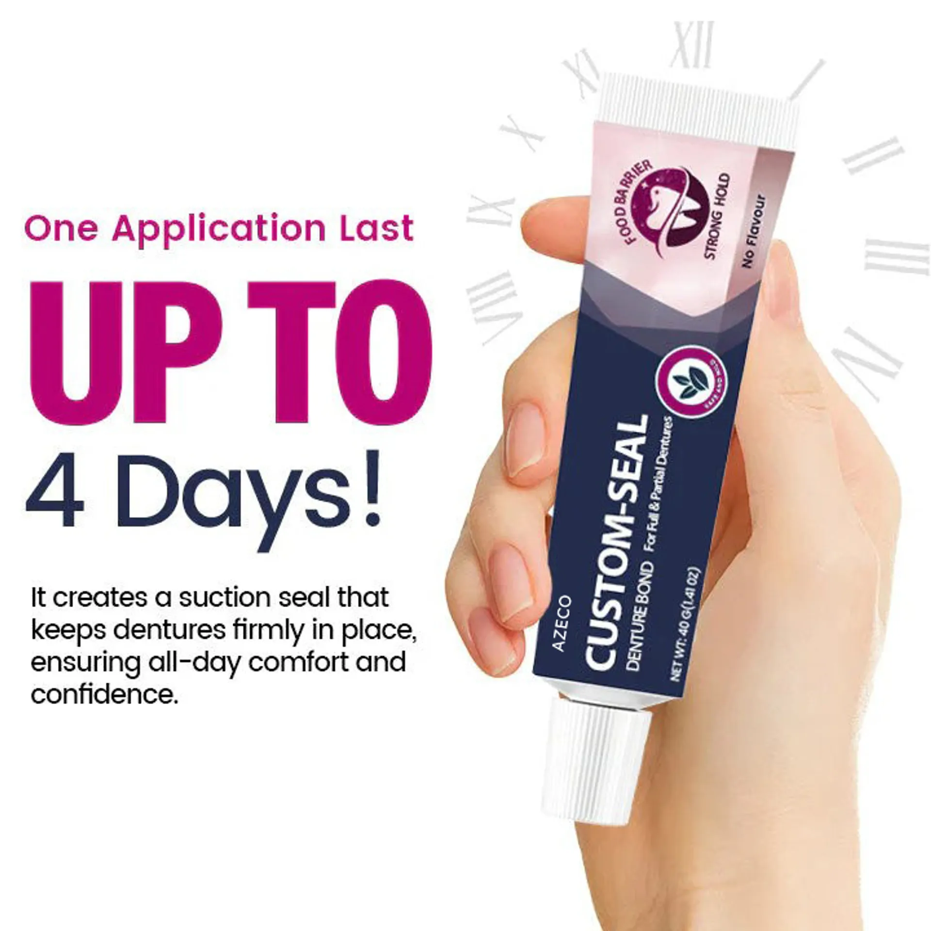 Unlike traditional adhesives that wear off after a few hours, AZECO® Custom-Seal Denture Bond provides up to four full days of secure hold with just one application. You can eat, talk, and live your life without constantly worrying about slippage or the need to reapply throughout the day.