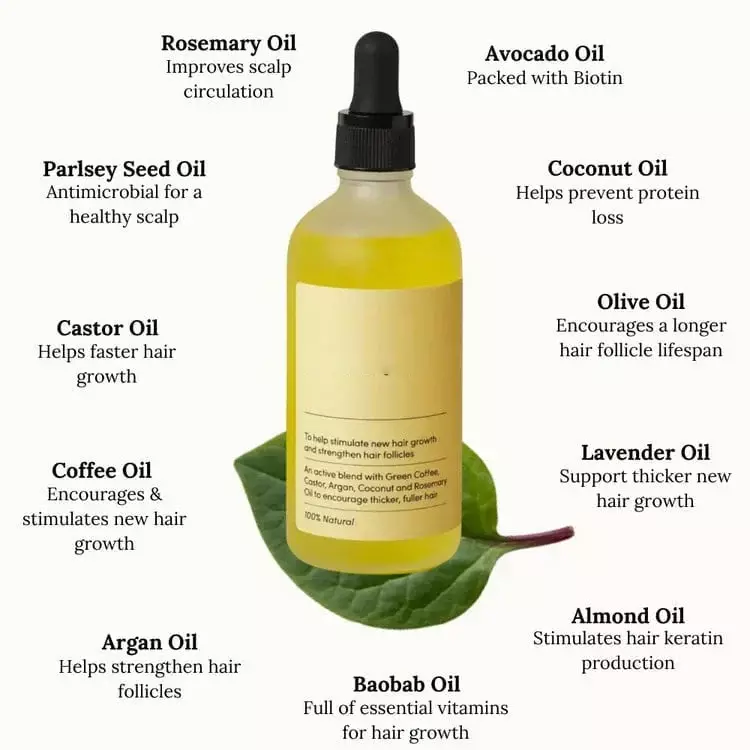 The oil blend is made from a powerful combination of 11 natural oils, each chosen for its role in stimulating hair growth and improving scalp health: