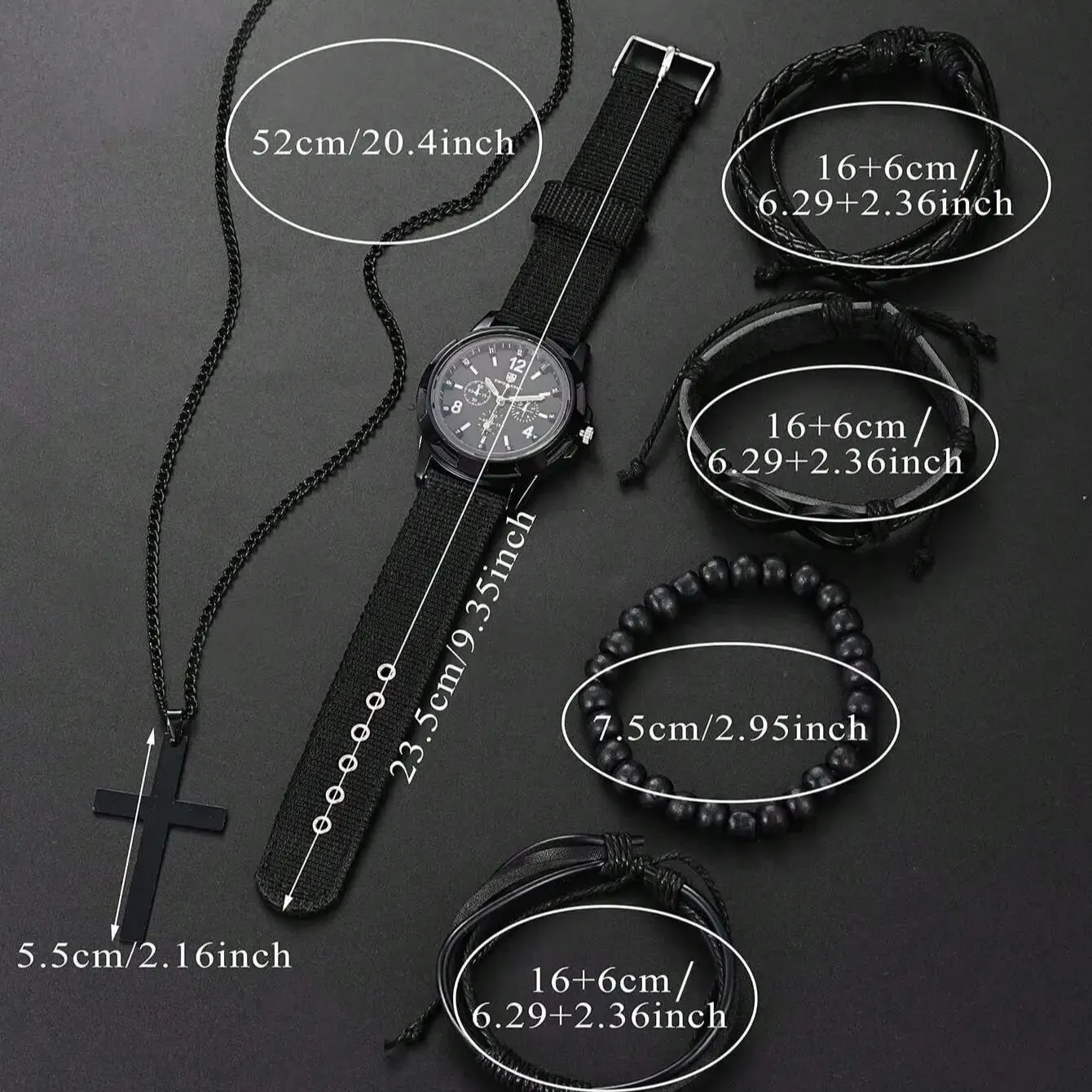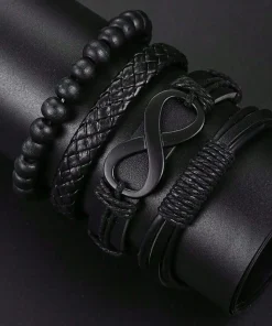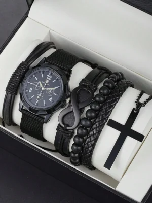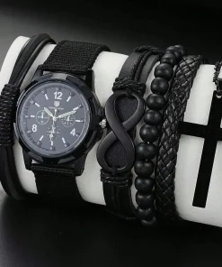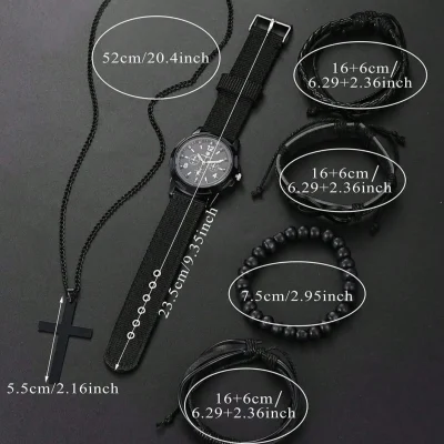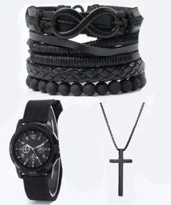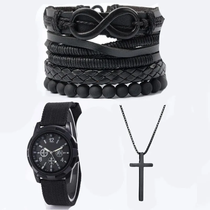 6pcs_Set Fashionable Pu Leather ‘8’ Shape Beaded Bracelet With Mechanical Watch, Cross Pendant Necklace For Men, Black-Colored