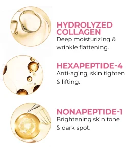 - Core ingredients: Hydrolyzed Collagen, Hexapeptide-1, Nonapeptide-1, Centella asiatica extract, Rose flower extract