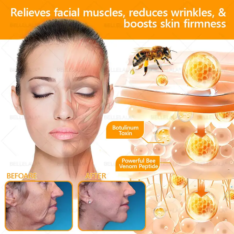 BELLELALA® BEE VENOM Wrinkle-Firming Multi-Purpose Cream uses bee venom peptides to mimic the effects of Botox, relaxing facial muscles and reducing the formation of expression lines. At the same time, hyaluronic acid deeply hydrates the skin, making it plump and effectively smoothing fine lines and wrinkles. The combination of Acetyl Hexapeptide-8 and botulinum toxin targets deep wrinkles like forehead lines and crow’s feet, leaving your skin looking firmer and smoother.