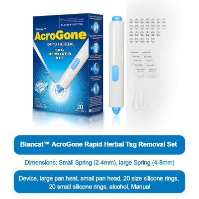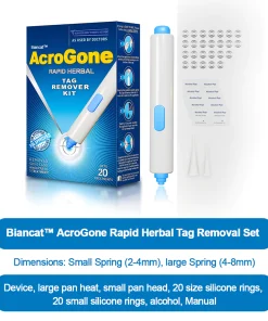Board-certified dermatologist Dr. Maggie Thompson conducted an eight-week clinical study to assess the efficacy and safety of Biancat™ AcroGone Rapid Herbal Tag Removal Set in reducing and eliminating skin tags. 100 participants were divided into the AcroGone and Control groups. The results showed AcroGone’s impressive success rate of 93% in reducing skin tags and 90% in achieving complete removal. The study affirmed AcroGone’s gentle and safe nature, with no reported adverse effects. Dr. Thompson confidently recommends AcroGone as an exceptional non-invasive and herbal solution for effective skin tag removal.