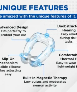 Biancat™ Auricalm uses gentle pressure and magnetic therapy to ease tinnitus symptoms. The device is designed to be easily molded and fitted to the Auditory Palace (SI19) area, while gentle pressure is applied to the tragus during sleep using adjustable clips. This reduces jaw and ear pressure, providing relief from ringing, ear pain, and headaches. Biancat™ Auricalm harnesses magnetic therapy to promote circulation, release tension, and potentially reduce tinnitus severity.