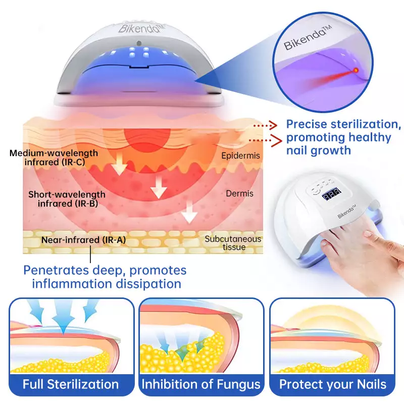Infrared cold lasers (typically between 650nm and 1000nm) are used for pain management and tissue restoration. These lasers penetrate deep into tissues, increasing cell metabolism, promoting faster nail growth, improving blood circulation, and helping heal infections and inflammation. This results in faster recovery for damaged nails and tissues.