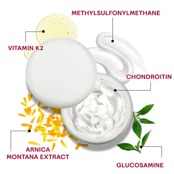 - Arnica Montana Extract, aqua, collagen, cartilaginous extract, chondroitin, vitamin K2, (MSM/DMSO2) methylsulfonylmethane, Vitamin B, Collagen type 2