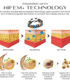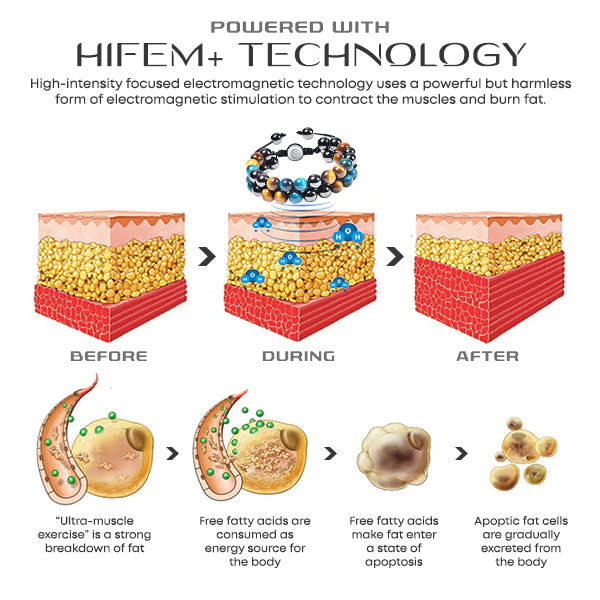 Introducing BLUSOMS™ LEANIC+ TripleGenix Men Bracelet, the innovative device designed to aid in achieving your weight loss goals. This state-of-the-art bracelet operates by releasing High-Intensity Focused Electromagnetic (HIFEM) elements into your body, thereby helping to burn excess calories and promote the development of lean muscle mass.