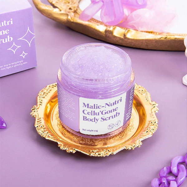 The blend of ingredients in our luxurious body scrub assists in weight reduction, propelling metabolic functions and waging an effective war against cellulite. As you begin to indulge in this luxurious skincare ritual, your skin will transition to a firmer, smoother, and noticeably radiant version of itself. Experience this elite transformation with Blusoms™ Malic-Nutri Cellu’gone Body Scrub, where beauty meets indulgence.