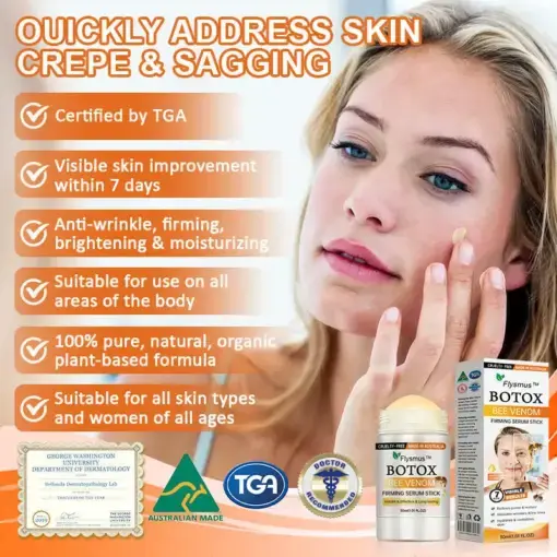 Endorsed by Dr. Sophia L Williams, a board-certified dermatologist with over 10 years of expertise in skincare,flysmus™ Botox Bee Venom Firming Serum Stick comes highly recommended. This exceptional product provides an ideal remedy for an array of skin issues, including neck lines, sagging arms, drooping breasts, chest discomfort, stretch marks, cellulite on the abdomen, thighs, and buttocks, as well as sagging buttocks, among others. Importantly, it achieves these results without any adverse side effects. Crafted entirely from 100% natural plant extracts, thiscream is suitable for all skin types, including sensitive skin.