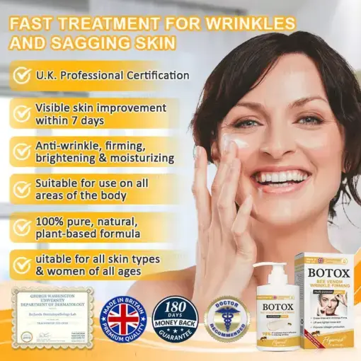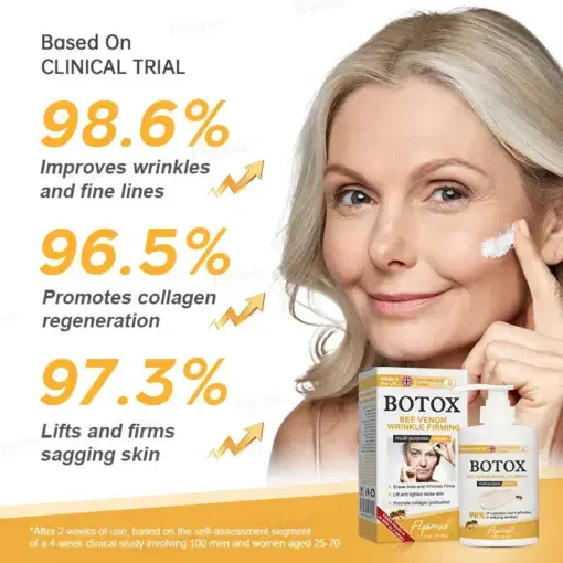 I decided to stop relying on injections and discovered Flysmus® Botox Bee Venom Wrinkle Firming Multi-Purpose Cream. This product helped me completely ditch the need for injections. After using it for less than a month, my skin is visibly firmer, the fine lines are reduced, and the sagging is gone. My skin feels radiant and bouncy again! The best part? No more needle marks or unnatural results. My skin is so smooth after applying it—nothing like that stiff feeling I used to have. The results exceeded my expectations!”— Jessica, 45, California