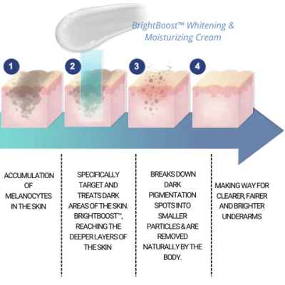 The BrightBoost™ Whitening & Moisturizing Cream lightens dark elbow and knees, discoloration on your face and neck, inner leg and bikini areas, underarms, and other areas in as fast as three days.