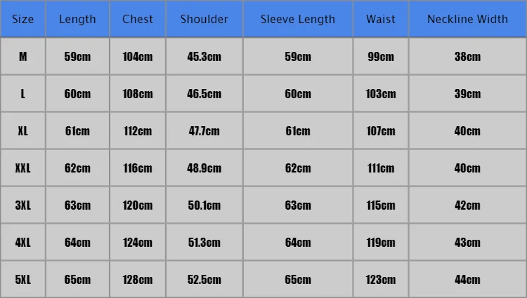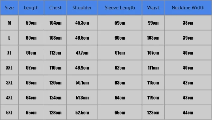 | Size | M, L, XL, XXL, XXXL, 4XL, 5XL |