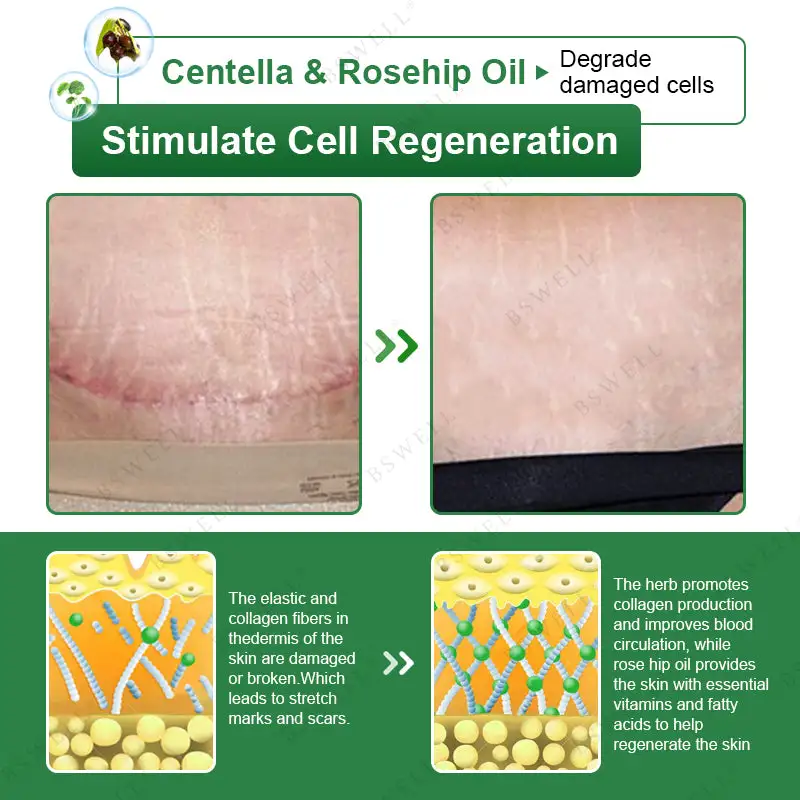 A study from the Journal of Dermatology showed that Centella Asiatica significantly enhances skin healing and elasticity. Rosehip oil, abundant in essential fatty acids, vitamin A, and C, improves skin regeneration, lightens dark spots, and effectively reduces scars and stretch marks.