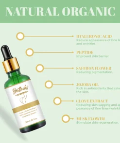 - Hyaluronic Acid, Peptides, Saffron Flower, Jojoba Oil, Clove Extract and Musk Flower