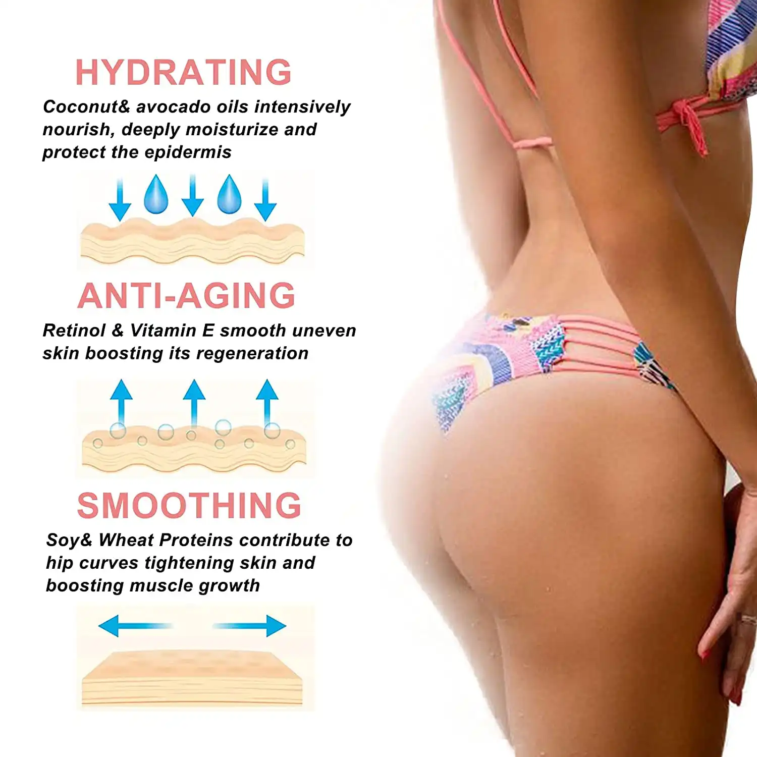 ButtUP LiftPlump Massage Cream helps increase skin metabolism, activate the sleeping cells in the buttocks, reduce cellulite and tighten the skin around the butt area, it will firm, plump, and lift your buttocks. Improve flabbily, sagging, and flat buttocks, effectively shaping the hip line. Deeply improve moisture retention of the skin in the buttocks and hip area for a smoother skin surface that glows from the inside out.