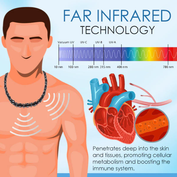 The necklace emits long-wavelength infrared radiation, which penetrates deep into the skin and tissues, promoting cellular metabolism and boosting the immune system. This can help improve circulation, reduce inflammation, and support overall cardiovascular health.