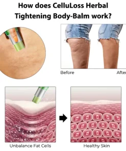 CelluLoss Herbal Tightening Body-Balm a powerful blend of Herbal Ingredients works to reduce the appearance of cellulite by firming skin and smoothing out unwanted bumps. Our formula also includes high quality herb extract which stimulates circulation allowing nutrients to get to skin cells.