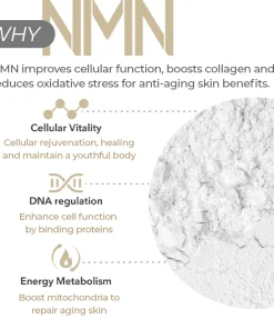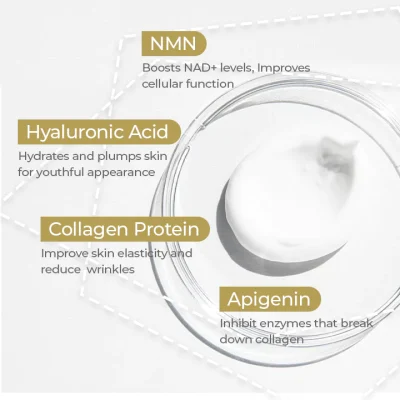- Core ingredients: Pure NMN (nicotinamide mononucleotide), Collagen, Hyaluronic Acid