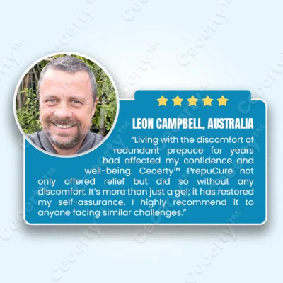 “Dealing with the discomfort of excess foreskin for years had a real impact on my confidence. Ceoerty™ PrepuCure didn’t just provide relief—it did so without any irritation. This gel has truly boosted my self-esteem and I feel more at ease. If you’re facing similar challenges, I can’t recommend it enough!” – Leon Campbell, Australia