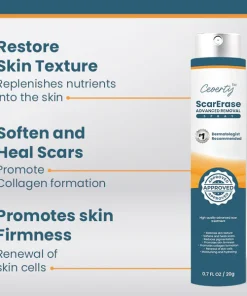 If you’re tired from so many skincare treatments for so many purposes but with none to effectively and safely cleanse the skin of the most obvious flaws, then our Ceoerty™ ScarErase Advanced Removal Spray might be just the product you need as it will moisturize and soothe your skin by increasing hydration of the stratum corneum (the uppermost layer of the skin). This facilitates regulation of fibroblast production and also reduces collagen production. Essentially, this allows skin to “breathe”, improving the tissue in mere days