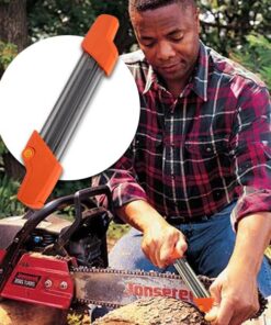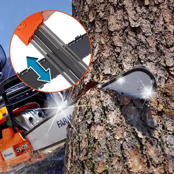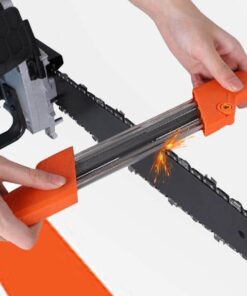 A practical tool to hone dull chainsaw teeth and lower the depth gauge easily. Just snap around the blade and activate the chains to start honing.
