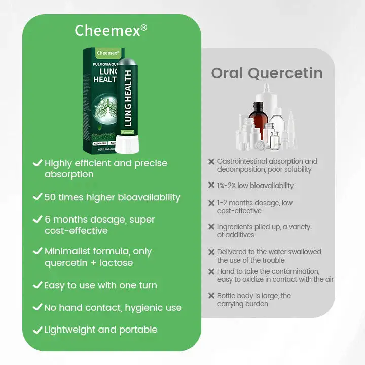 Cheemex® Lung Health Detox Inhaler changes that. Using advanced 5-micron ultra-fine powder technology, it delivers pure quercetin straight to the alveoli for up to 98% absorption—that’s 50× more efficient than capsules or tablets. Each inhale gives your lungs fast, concentrated antioxidant and detox support—making easier breathing not just possible, but natural.