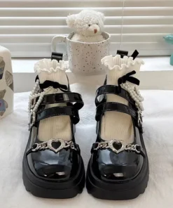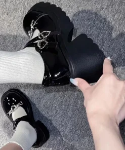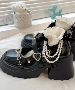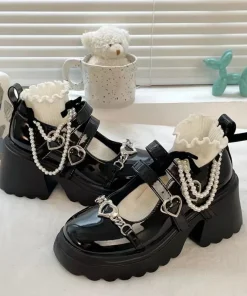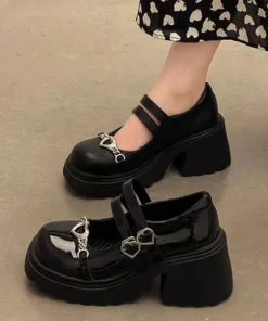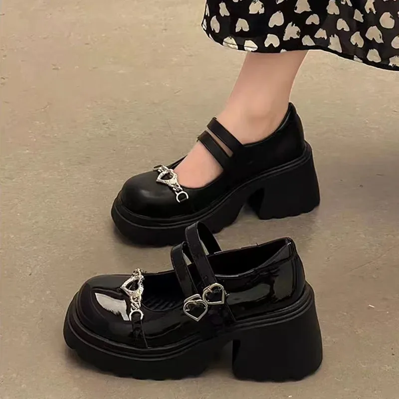 Sweet Heart-Shaped Buckle Lolita Shoes Women Patent Leather Platform Mary Janes Woman Metal Decoration Chunky Heels Pumps 2023