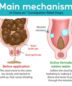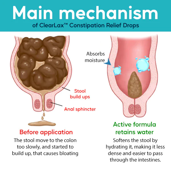 ClearLax™ Constipation Relief Drops work by providing a gentle and effective solution to relieve constipation. When taken orally, the liquid drops are absorbed into the digestive system, where they work to soften the stool and promote regular bowel movements.