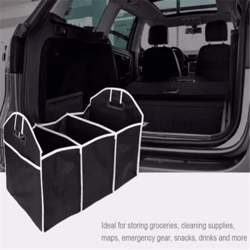 This foldable luggage organizer has three large compartments for sporting goods, backpacks, books, groceries or security items. Features Divided into 3 parts, easy to store cleaning cards, built-in handles for emergency equipment and groceries, sturdy polyester canvas material, foldable storage.