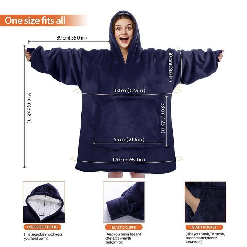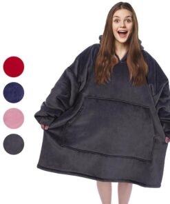 The coziness of a blanket with the fit of your favorite sweatshirt is here. With extra-large sleeves, a giant warm hood, and a roomy front pocket, the blanket keeps you warm and cozy while lounging at home, watching TV, family game night, camping, sporting events, or anything in between.
