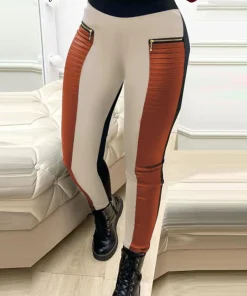 Contrast Panel Zipper Detail Faux Leather Pants has the following product features: